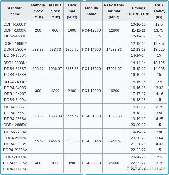可以看到,这几个内存频率下,读取速度几乎没差别,其实内存的带宽相对来说已经足够大,真正的短板在于硬盘。这里附上维基百科给出的内存频率-带宽对比表格:
