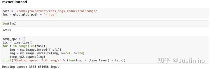 从代码里面可以看到,先用opencv读取图片,然后统一进行resize到(224, 224)的操作,固态硬盘的读取速度差不多是机械硬盘的7倍!然后笔者为了皮一下,用mxnet的API来测试一下在固态上的读取速度: