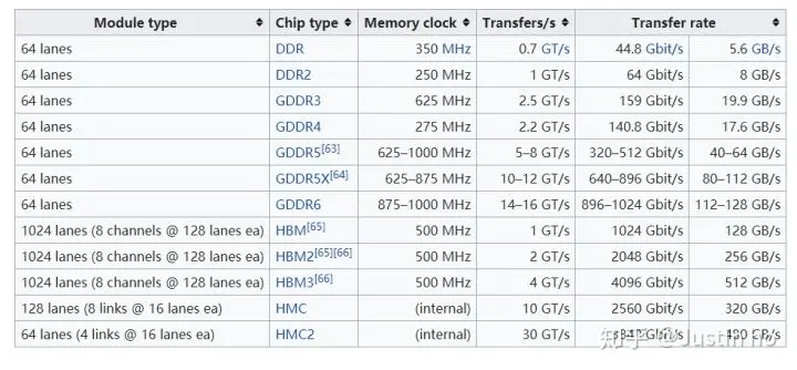 最新几代的显存颗粒类型分别有GDDR5X(1080ti)、GDDR6(2080ti)、HBM、HBM2(V100),对应的带宽如下表: