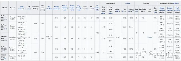 CUDA核心数基本确定了一张显卡的算力,当前服务器级别算力最强的Tesla V100显卡拥有高达5120个cuda核心;工作站级别最强的RTX 8000显卡以及TITAN系列最强的RTX TITAN,CUDA数为4608个;而当前桌面级别最强的RTX2080ti,拥有4352个CUDA核心(很快这些当前最强就会变成老爷车了)。核心数越多意味着执行并行计算的量就更多。详细的显卡规格对比可以参考维基百科:List of Nvidia graphics processing units