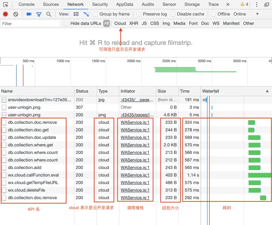 Network 面板展示云开发请求信息:从微信开发者工具 1.02.1905302 及基础库 2.7.1 起,在小程序 Network 面板中会显示云开发请求信息,包括调用所实际请求的环境 ID、请求体、JSON 回包、耗时、及调用堆栈。