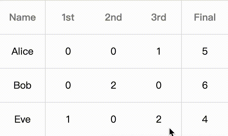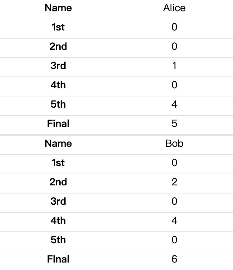 <table> <thead> <tr> <th>Name</th> <th>1st</th> <th>2nd</th> <th>3rd</th> <th>4th</th> <th>5th</th> <th>Total</th> </tr> </thead> <tbody> <tr> <td data-th="Name">Alice</td> <td data-th="1st">0</td> <td data-th="2nd">0</td> <td data-th="3rd">1</td> <td data-th="4th">0</td> <td data-th="5th">4</td> <td data-th="Final">5</td> </tr> <tr> <td data-th="Name">Bob</td> <td data-th="1st">0</td> <td data-th="2nd">2</td> <td data-th="3rd">0</td> <td data-th="4th">4</td> <td data-th="5th">0</td> <td data-th="Final">6</td> </tr> </tbody></table>