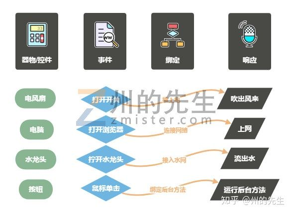 一件家具电器,有其属性,比如大小、颜色、功率等等;也有其功能(方法),比如净水器(控件),一般布置于厨房(布局),接受自来水(参数),返回纯净水(返回结果);比如抽湿机,一般放置在室内,指定从进风口接受空气,然后从出风口返回除湿后的空气。