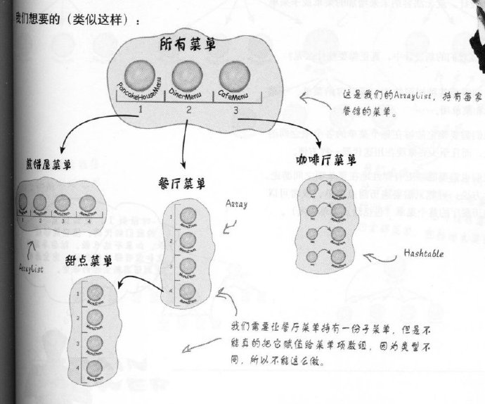 如果我们能让甜点菜单变成餐厅菜单集合的一个元素,那该有多好。但是根据现在的实现,根本做不到呀。我们想要的是这样的: