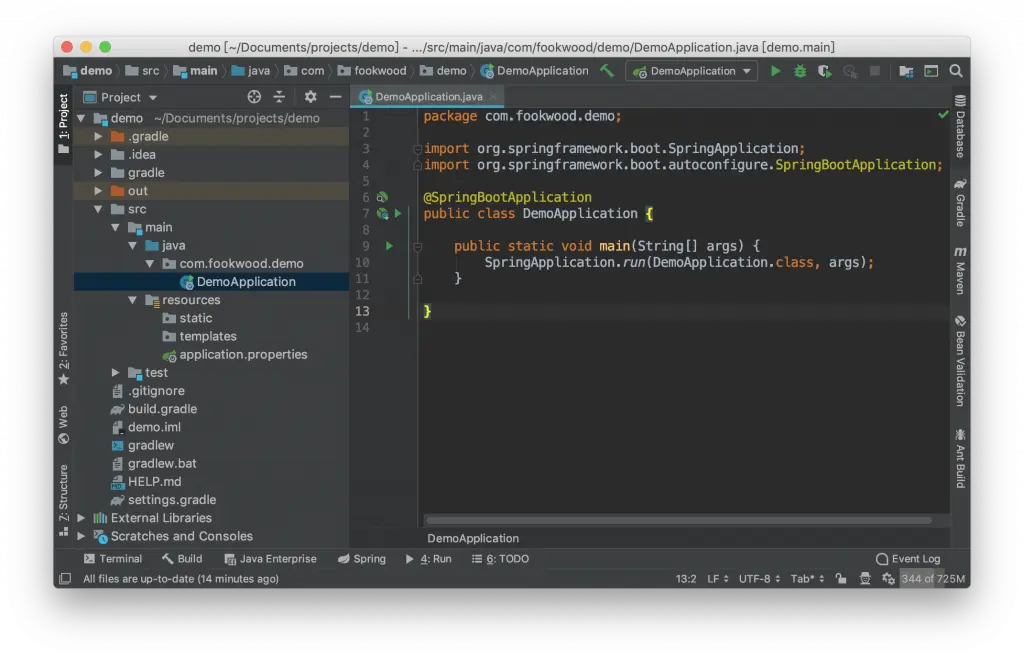 先来一张IntelliJ IDEA的截图,为项目刚创建时候的状态。左侧为项目目录区,右侧为代码区。左边,右边和下边都有工具栏,你可以打开终端,可以查看类结构,可以查看Build时候的信息,可以查看运行时候的信息,可以查看Gradle和Maven的依赖以及任务,可以连接数据库,可以查看Spring相关的东西比如各种Bean及其关联等等。界面最上方是文件的目录以及运行相关的按钮。