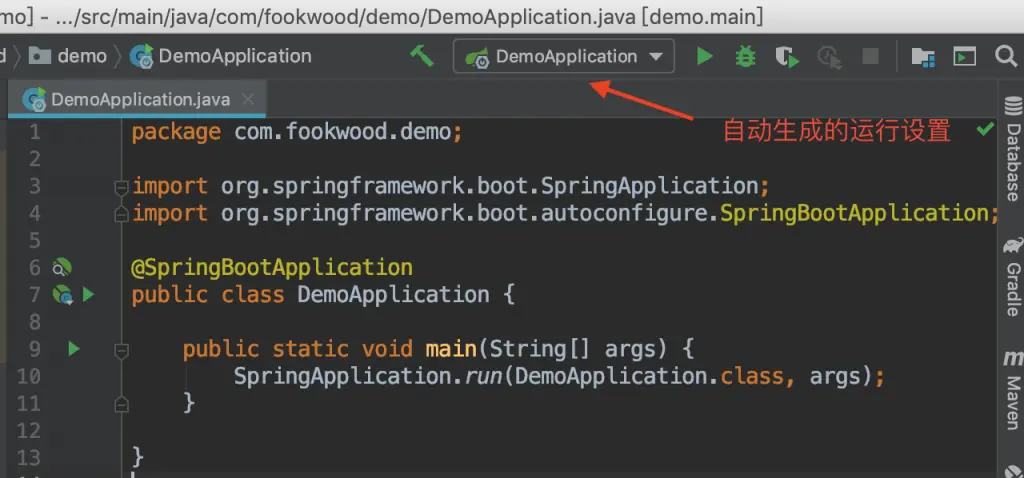 当你创建好项目后,目录中只有一个DemoApplication.java,这个类是整个程序的入口。当然类的名字可能不一样,根据你写的项目名称,类名也不一样,也许你的叫做BlogApplication,不管名字叫啥,类上总有一个 @SpringBootApplication 注解,这个注解的作用我们以后再详细说明。DemoApplication里有一个main方法,此方法可以作为程序的入口执行,在打开项目之后,IDEA会自动生成一个运行设置(Run Configuration),把DemoApplication作为程序运行的起点。