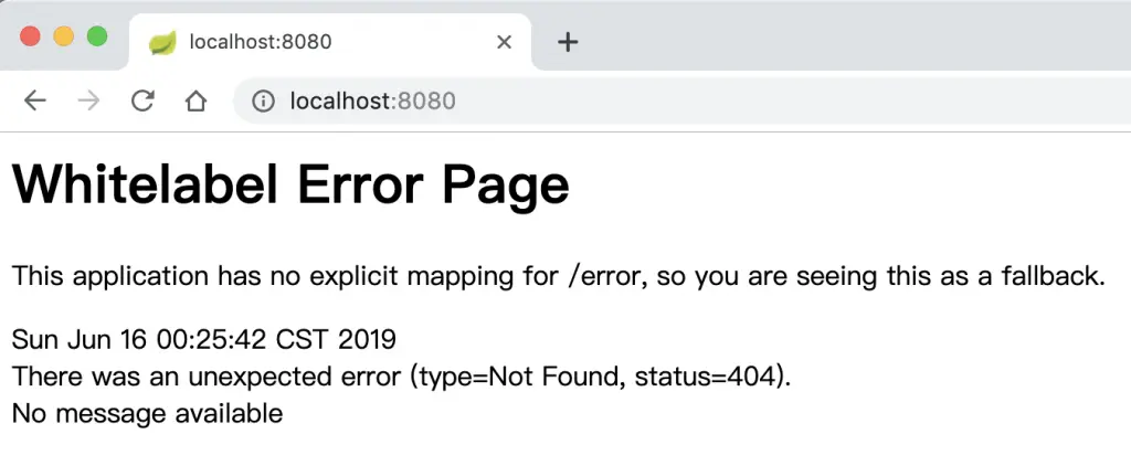 这里面是包含了很多东西的,比如Spring Boot版本是2.1.5,内置Tomcat的版本是9.0.19,Web服务器的端口是8080,进程ID为29536等等。这会儿你该疑惑了,我的程序都跑起来了,怎么没有网页跳出来呢?去哪里看呢?你可以打开 localhost:8080 看看: