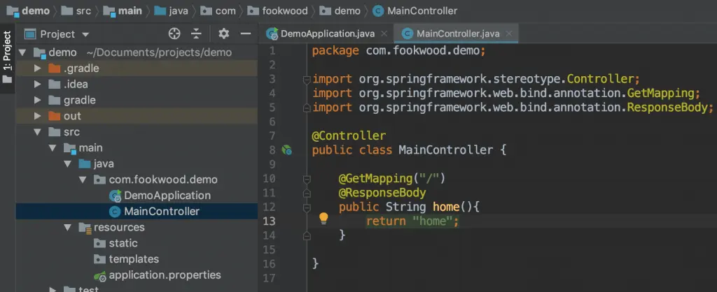 MainController上有一个 @Controller 注解,这个注解告诉框架这个类是用来处理Web请求的。类只有一个home方法,@GetMapping 注解告诉框架home方法可以处理”/”路径也就是根路径上的请求,@ResponseBody 注解表示home方法的返回值就是网络请求的结果,客户端最终会收到。重新运行项目,打开 localhost:8080 再看: