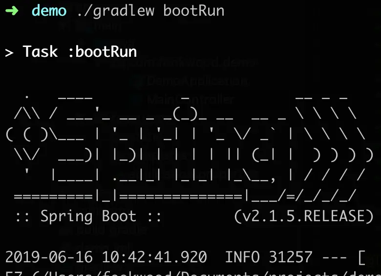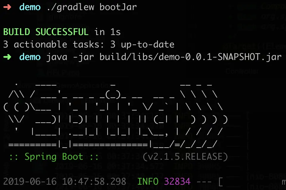 这样,我们的项目就启动了,跟在IDE里点“Run”是一样的效果,此时访问浏览器一样可以看到结果。你可能会注意到,还有一个任务叫做bootJar,这个任务就是用来打包的,最终会生成一个jar包,你可以拿来部署或者是演示等等。