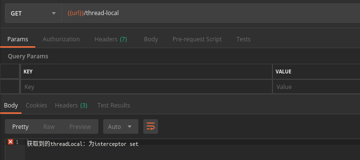 当请求GET /thread-local 时,由于未设置threadlocal filter打印结果为null,在interceptor 前设置了threadlocal,故打印 interceptor set,在controller中也为设置,返回值为interceptor set,interceptor 后同理为 interceptor set。