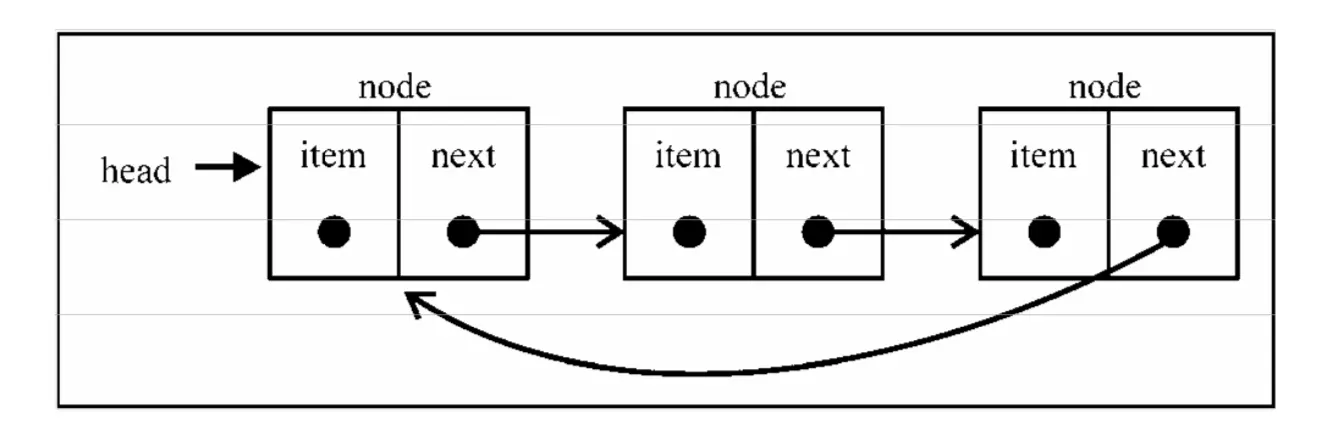 循环链表可以像链表一样只有单向引用,也可以像双向链表一样有双向引用。循环链表和链表之间唯一的区别在于,最后一个元素指向下一个元素的指针(tail.next)不是引用null, 而是指向第一个元素(head),如下图所示。