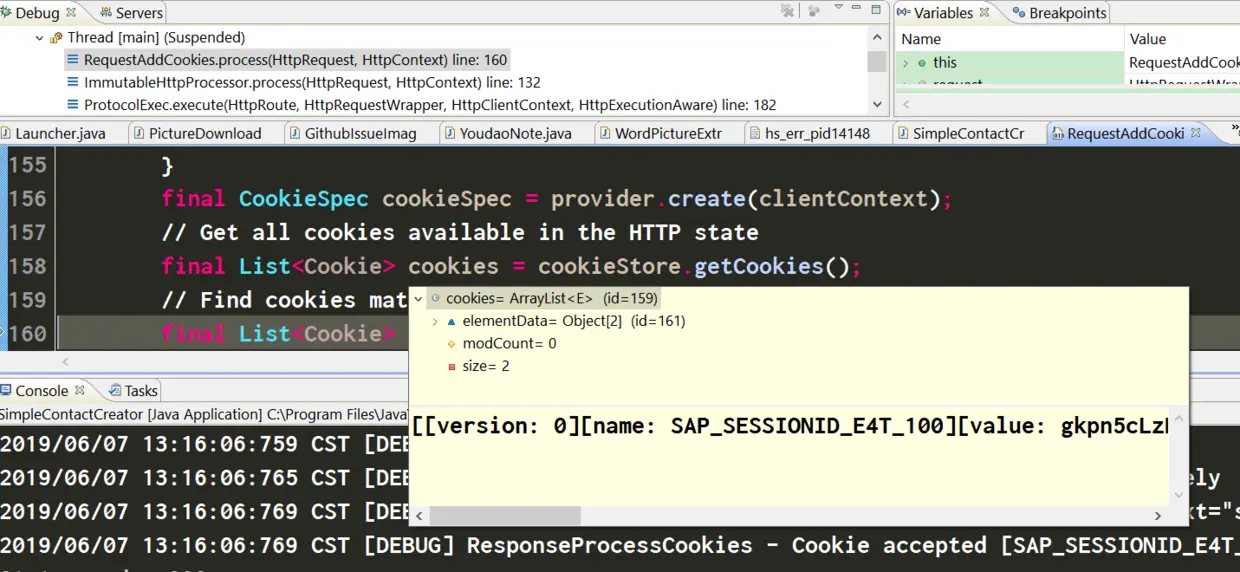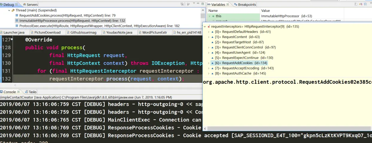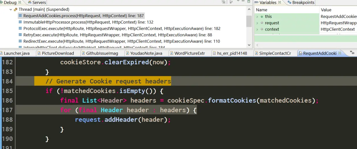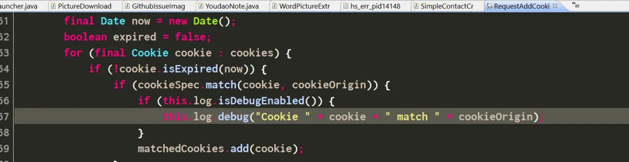 终于到了我要找的RequestAddCookies这个HTTPRequestInterceptor了。光从这个类的字面意思就能猜到它和HTTP请求的Cookie有关。