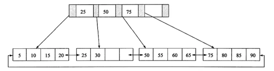 B+Tree是为磁盘或其他直接存取辅助设备设计的一种平衡查找树。在B+Tree中,所有记录节点都是按键值的大小顺序存放在同一层的叶子结点上,由各叶子结点指针进行连接。先来看一个B+Tree,其高度为2,每页可存放4条记录,扇出(fan out)为5,如图所示