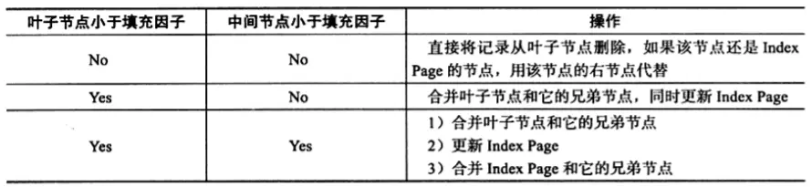 B+Tree使用填充因子来控制树的删除变化,50%是填充因子可设的最小值。B+树的删除操作同样必须保证删除后叶子节点中的记录依然有序,同插入一样,B+Tree的删除操作同样需要考虑一下三种情况,与插入不同的是,删除根据填充因子的变化来衡量。
