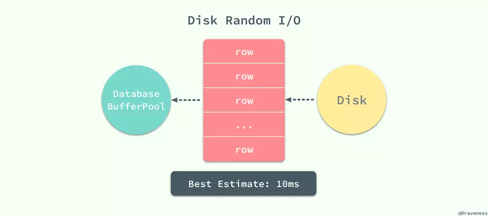 这 10ms 的一次随机读取是按照每秒 50 次的读取计算得到的,其中等待时间为 3ms、磁盘的实际繁忙时间约为 6ms,最终数据页从磁盘传输到缓冲池的时间为 1ms 左右,在对查询进行估算时并不需要准确的知道随机读取的时间,只需要知道估算出的 10ms 就可以了。