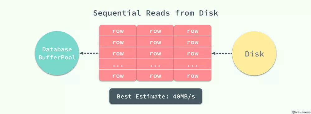 从磁盘读取数据并不是都要付出很大的代价,当数据库管理程序一次性从磁盘中顺序读取大量的数据时,读取的速度会异常的快,大概在 40MB/s 左右。