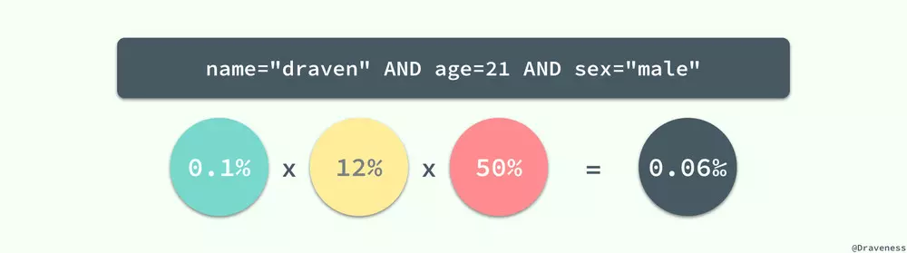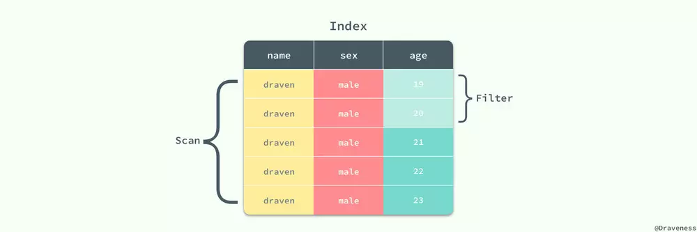 对于 users 表来说,sex=”male” 就不是一个好的过滤因子,它会选择整张表中一半的数据,所以在一般情况下我们最好不要使用 sex 列作为整个索引的第一列;而 name=”draven” 的使用就可以得到一个比较好的过滤因子了,它的使用能过滤整个数据表中 99.9% 的数据;当然我们也可以将这三个过滤进行组合,创建一个新的索引 (name, age, sex) 并同时使用这三列作为过滤条件: