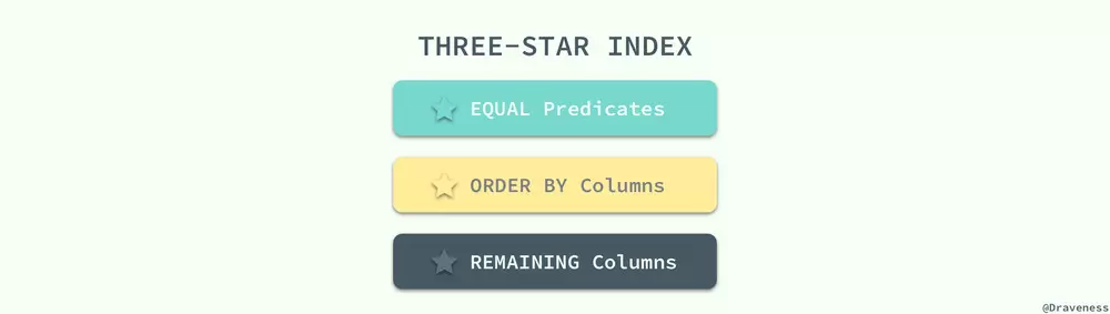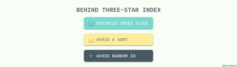 如果对于一个查询语句我们依照上述的三个条件进行设计,那么就可以得到该查询的三星索引,这三颗星中的最后一颗星往往都是最容易获得的,满足第三颗星的索引也就是上面提到的宽索引,能够避免大量的随机 IO,如果我们遵循这个顺序为一个 SQL 查询设计索引那么我们就可以得到一个完美的索引了;这三颗星的获得其实也没有表面上这么简单,每一颗星都有自己的意义: