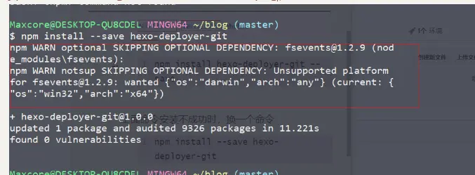 PS:出现这两个警告的话不用担心其实你已经安装成功了,fsevent是mac osx系统的,在windows或者Linux下使用了所以会有警告,忽略即可。