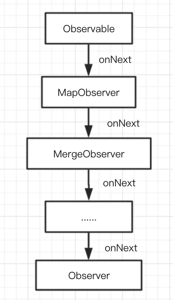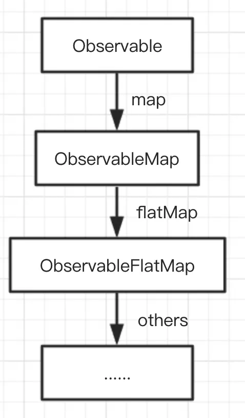 一条 RxJava 事件流(或者说链)的建立其实就是我们在链式调用地使用各种操作符,不断往代码后面续的时候,这时候每个操作符都会生成一个对应的 Observable 来承接上下游,简图如下。