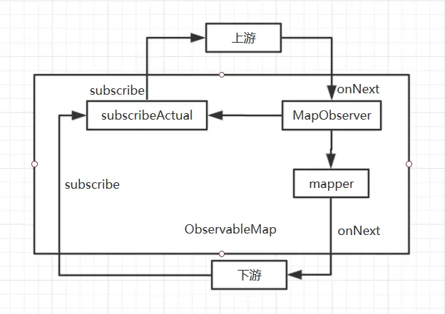 举个简单的例子,map 操作符在建立链的时候返回的是 ObservableMap,和上游的源一样是 Observable 的一个子类。它在被 subscribe 的时候会去调用 subscribeActual 方法,在这里调用 source.subscribe(new MapObserver<T, U>(t, function)),调用到源的 subscribe 方法,从而实现订阅从下游往上游传递,同时也实现了自己的操作逻辑,把上游订阅给自己的一个静态内部类 MapObserver。MapObserver 是对下游观察者进行了一次装饰,和其他观察者一样都实现了 Observer,在收到上游的事件传递 onNext(T t) 时,先调用 Function<? super T, ? extends U> mapper 实现自己的逻辑,再分发给下游 downstream.onNext(v)。