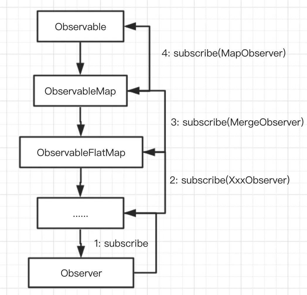 当我们对某条 RxJava 链调用 subscribe 方法时,就会触发整条链的订阅过程,从而从下游 subscribe 的地方开始,一级一级往上游传递订阅的事件,简图如下。