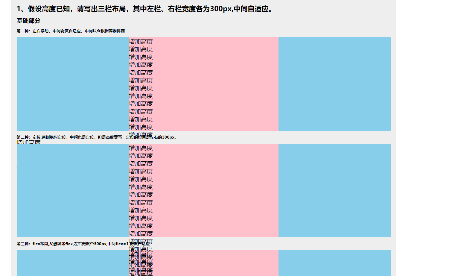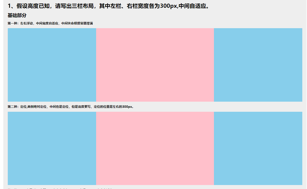 <section class="contain mar_b10"> <h6 class="mar_b10 "> 第二种:定位,两侧绝对定位,中间也是定位,但是高度要写,定位的位置是左右的300px。 </h6> <article class="two_height"> <div class="two_left"></div> <div class="two_mid"></div> <div class="two_right"></div> </article> </section>css
