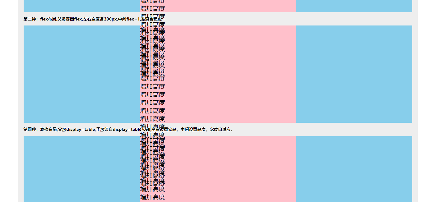 .three_height { width: 100%; height: 250px; display: flex;}.three_left,.three_right { width: 300px; height: 250px; background-color: skyblue;}.three_mid { flex: 1; background-color: pink}第四种:表格布局,父级display=table,子级各自display=table-cell,左右设置宽高,中间设置高度,宽度自适应。