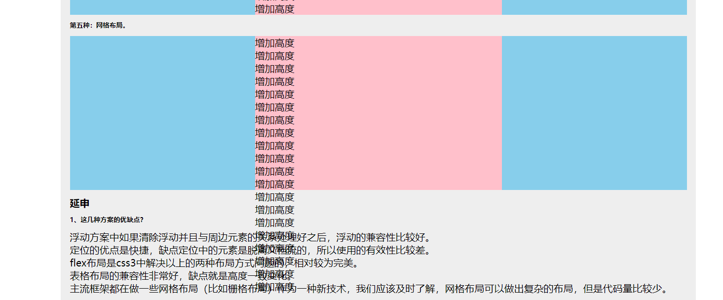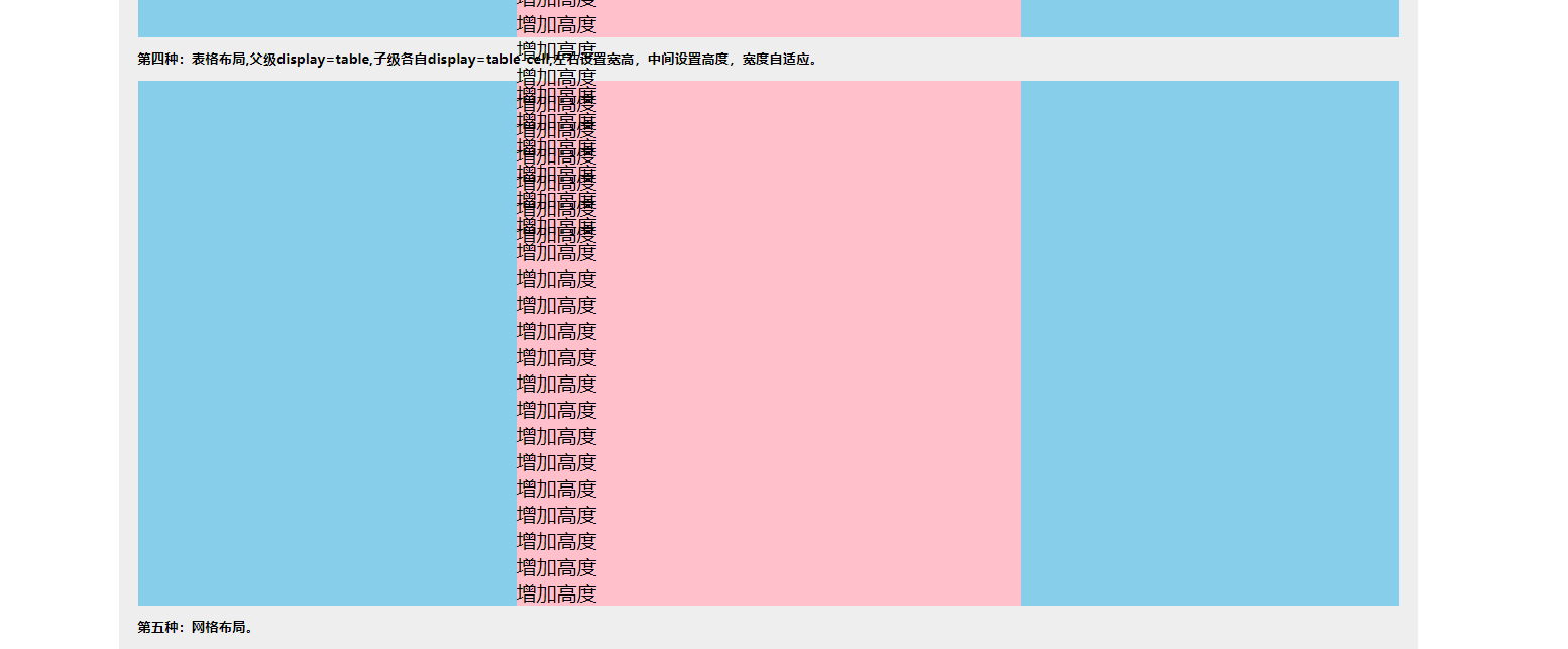 .four_height { width: 100%; height: 250px; display: table;}.four_left, .four_right{ display: table-cell; width: 300px; height: 250px; background-color: skyblue;}.four_mid{ display: table-cell; height: 250px; background-color: pink;}第五种:网格布局。