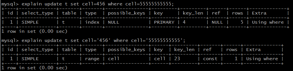 explain update t set cell=456 where cell=55555555555;