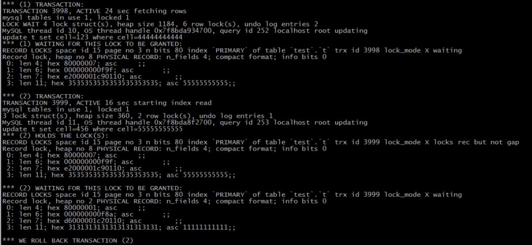 (4)正在等待锁释放(waiting for this lock to be granted),记录锁(record locks),主键索引上(index primary),互斥锁(lock_mode X),物理记录(physical record),asc 11111111111;