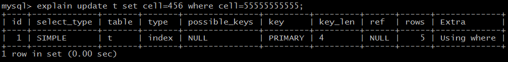 explain update t set cell= '456 ' where cell= '55555555555 ';