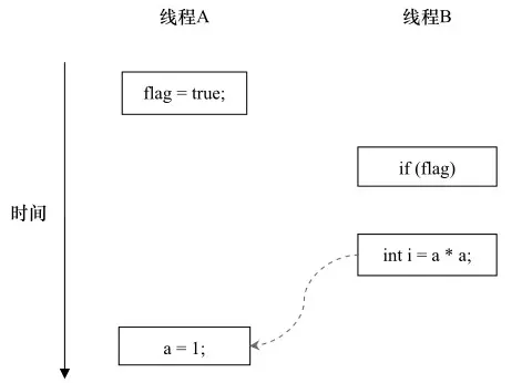 flag变量是个标记,标识a是否已被写入。假设有两个线程A和B,A首先执行了写操作writer(),随后B接着执行读操作reader()方法。那么线程B在执行操作(4)时,是否能看到线程A在操作(1)时对共享变量a的写入?答案是未必能看到。因为在重排序时,A线程可能先标识了flag变量,再对a变量进行写入,但是在它们发生之间,B线程此时来读了,该程序的语义被破坏了。如下程序执行时序图: