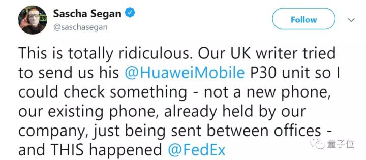 他们的记者想从英国寄一部华为P 30到美国的办公室,结果几天后被联邦快递退回去了。