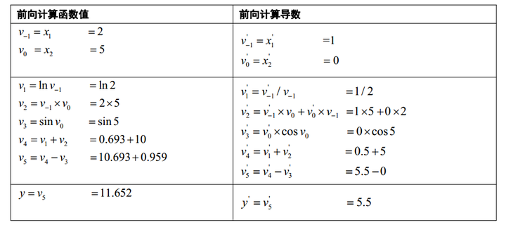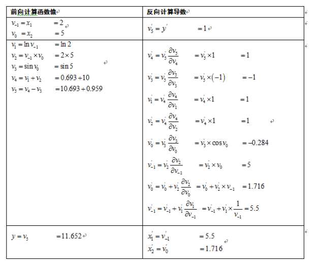 表的第一列为前向计算函数值的过程,与前向计算时相同。第二列为反向计算导数值的过程。第1步计算y对 的导数值,由于