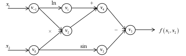 前向模式从计算图的起点开始,沿着计算图边的方向依次向前计算,直到到达计算图的终点。它根据自变量的值计算出计算图中每个节点的值 以及导数值 ,并保留中间结果。直到得到整个函数的值和其导数值。整个过程对应于一元复合函数求导时从最内层逐步向外层求导。