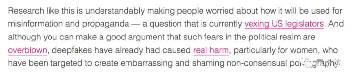 这样的研究总让人们担忧,怕它会被用在谣言和政治宣传上,实在是让美国立法者们伤脑筋。当然,你也可以说这种在政治领域的威胁没那么严重,但deepfakes已经确确实实伤害了一些人,尤其是女性,在未经同意的情况下被用来制造了又难堪又羞辱的色情视频。