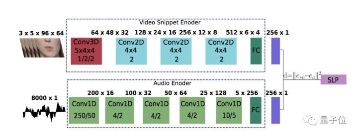 同步鉴别器(Synchronization Discriminator)加强了对视听同步的要求,决定画面和音频应该如何同步。它使用了两种编码器获取音频和视频的嵌入信息,并基于欧式距离给出判断。