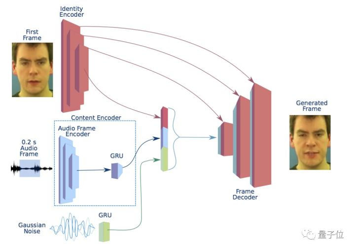 这个生成器由内容编码器(Content Encoder),一个鉴别编码器(Identity Encoder)、一个帧解码器(Frame Decoder)和声音解码器(Noise Generator)组成,不同模块组合成一个可嵌入模块,通过解码网络转换成帧。