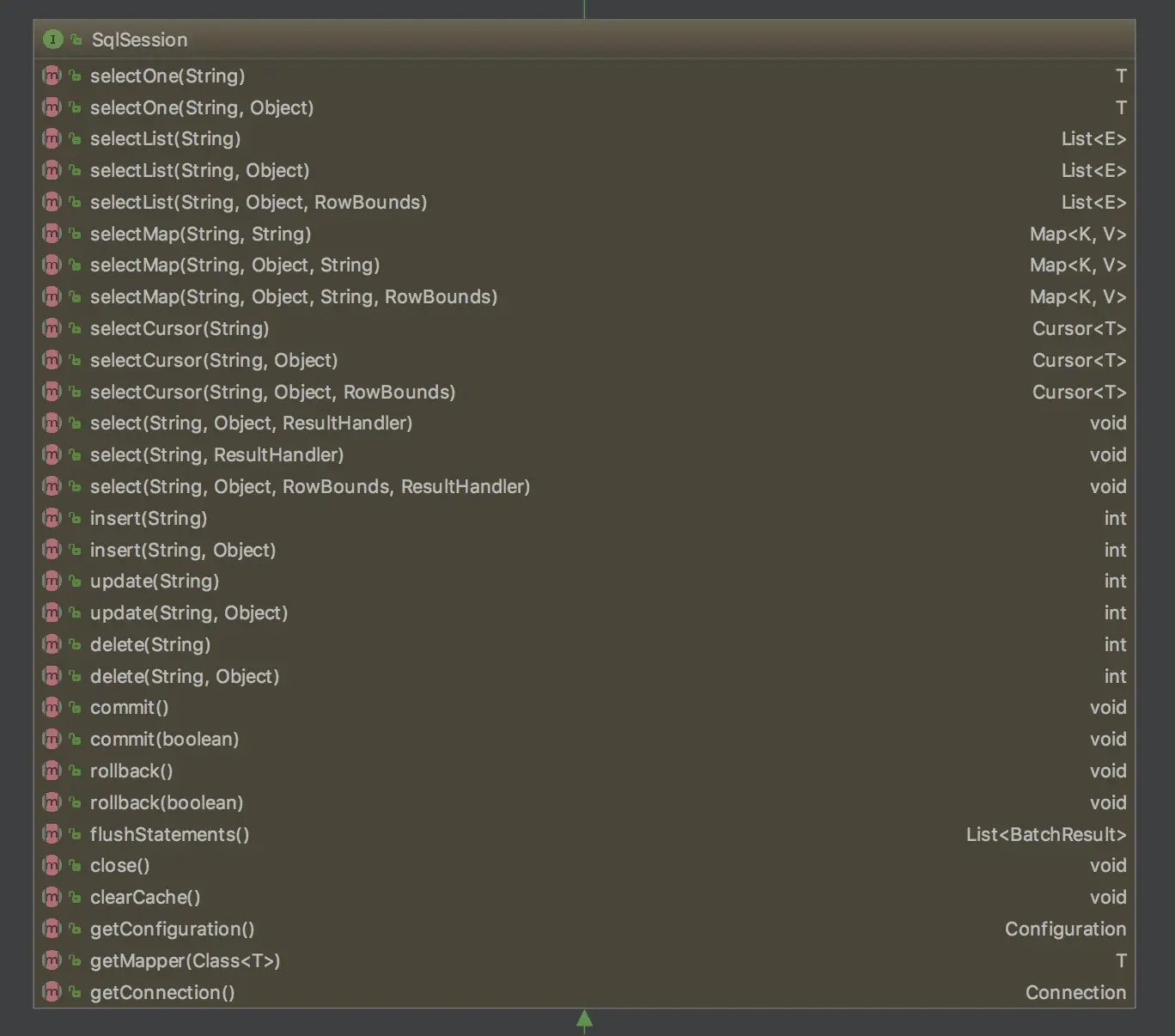 SqlSession: 对外提供了用户和数据库之间交互需要的所有方法,隐藏了底层的细节。默认实现类是DefaultSqlSession。
