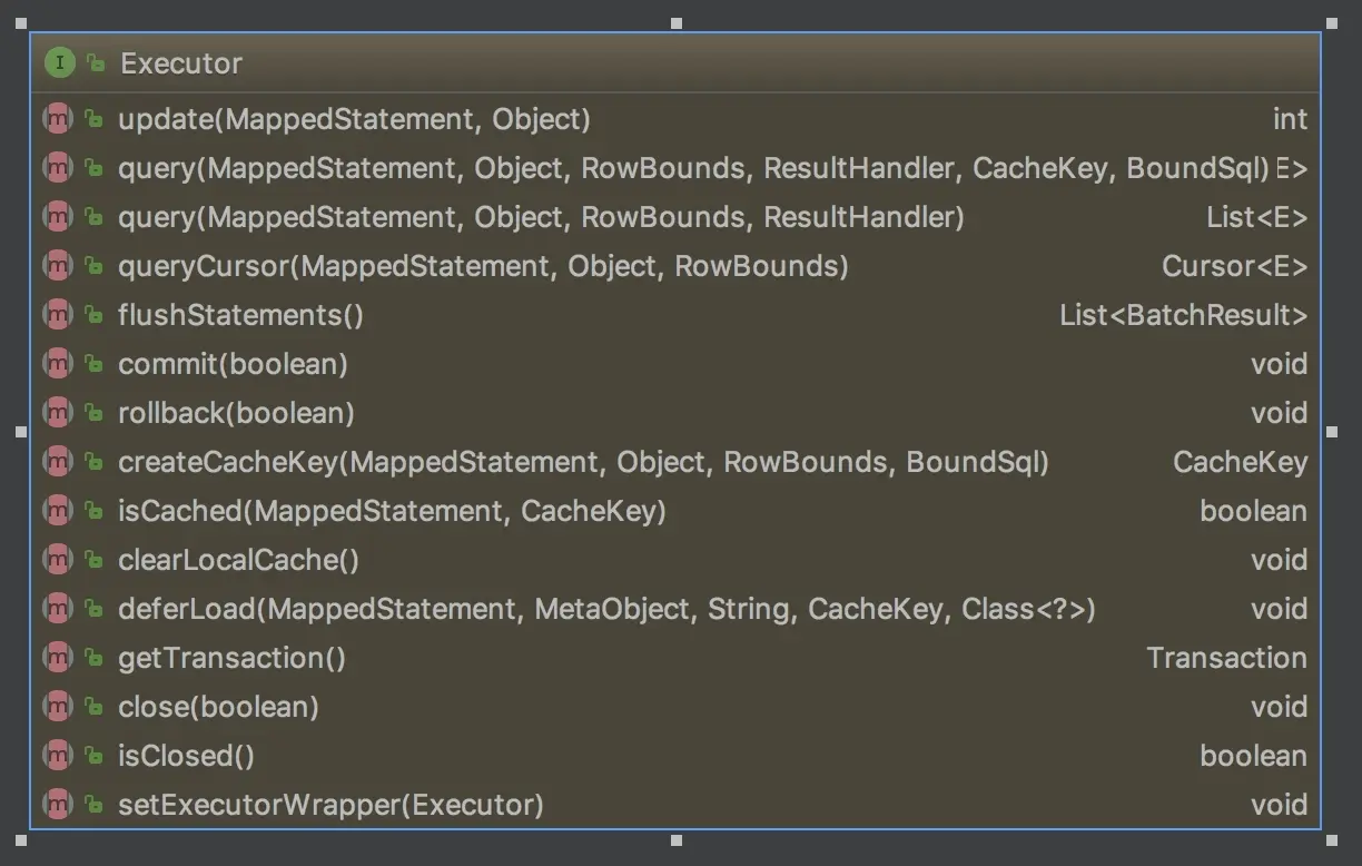 Executor: SqlSession向用户提供操作数据库的方法,但和数据库操作有关的职责都会委托给Executor。