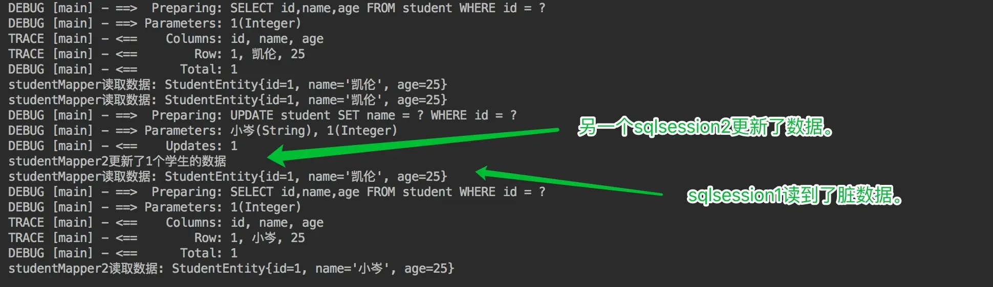 sqlSession2更新了id为1的学生的姓名,从凯伦改为了小岑,但session1之后的查询中,id为1的学生的名字还是凯伦,出现了脏数据,也证明了之前的设想,一级缓存只在数据库会话内部共享。