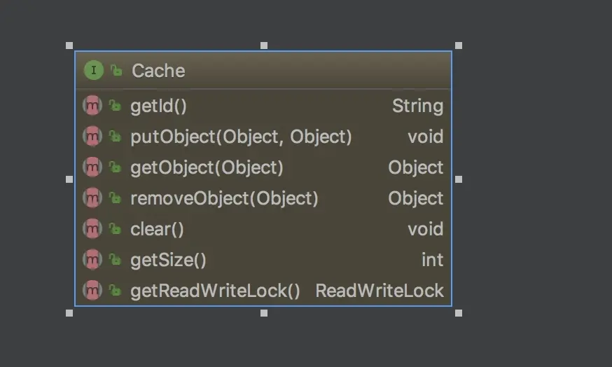 Cache: MyBatis中的Cache接口,提供了和缓存相关的最基本的操作,如下图所示: