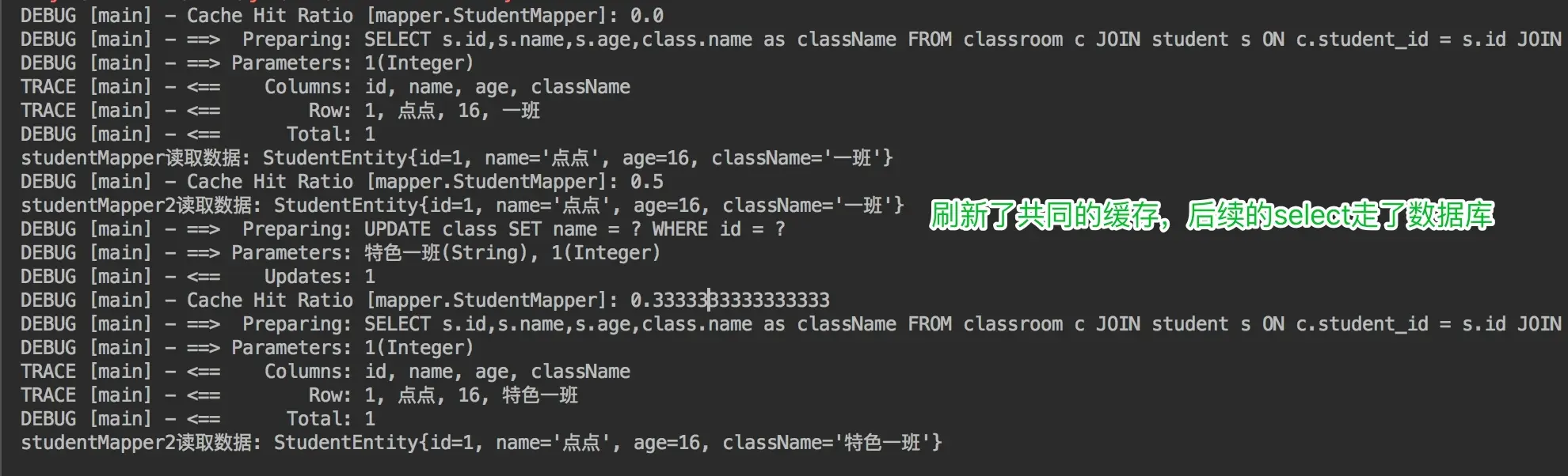 为了解决实验4的问题呢,可以使用Cache ref,让ClassMapper引用StudenMapper命名空间,这样两个映射文件对应的SQL操作都使用的是同一块缓存了。