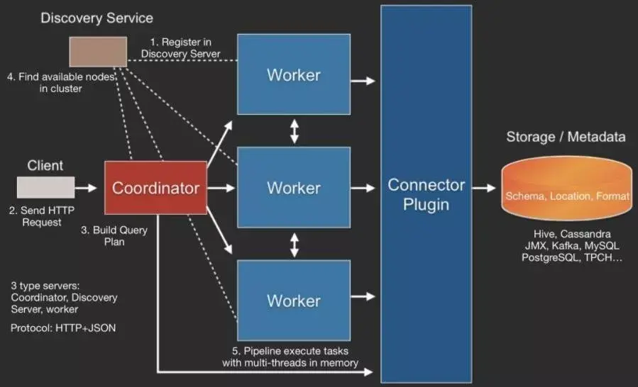 Connector Plugin(连接插件):连接Storagr,提供元数据,支持Hive、Kafka、MySQL、MonogoDB、Redis、JMX等数据源,可自定义