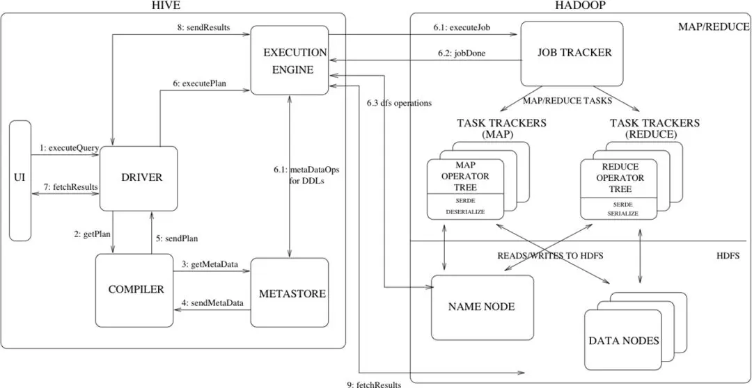 Step 6,6.1,6.2,6.3:由compiler生成的执行计划是阶段的DAG,每个阶段都会涉及到Map/Reduce job,元数据的操作或者HDFS文件的操作。