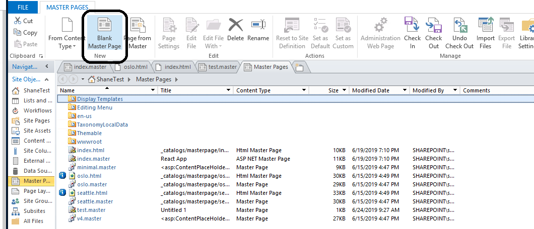 Sharepoint自身提供了Sharepoint Designer这个工具用来设计和管理Sharepoint中的相关元素,其中就包含了对Master Page的设计和管理,我们可以通过Sharepoint Designer新建一个Blank Master Page, 如图所示: