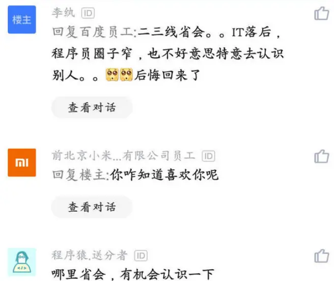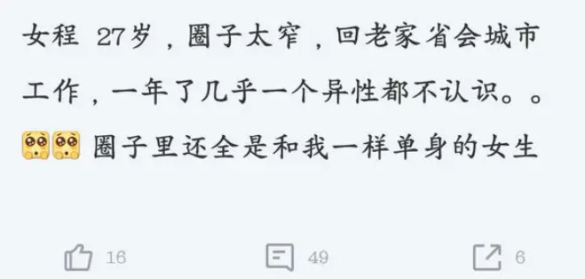 原来,这位女生是一位在省会城市工作的程序员。说到程序员,相信很多人都会在第一时间里想到男生,但这位女生却也是一位程序员。但这位女程序员却遇到了男程序员一样的问题:和异性交往太难。据这位女程序员说道:自己今年27岁,因为圈子太窄的问题,如今在省会城市工作了1年,几乎一个异性都不认识,更重要的是,圈子里还全是和我一样单身的女生。