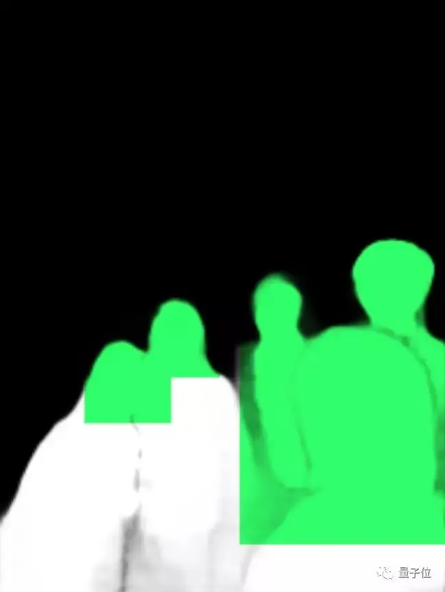 这里,要用人物分割算法,给输入图像里的人类做个Mask;再用人脸检测器,标出脸部的边界框。最后,把Mask和边界框的交集,用绿色标注出来。