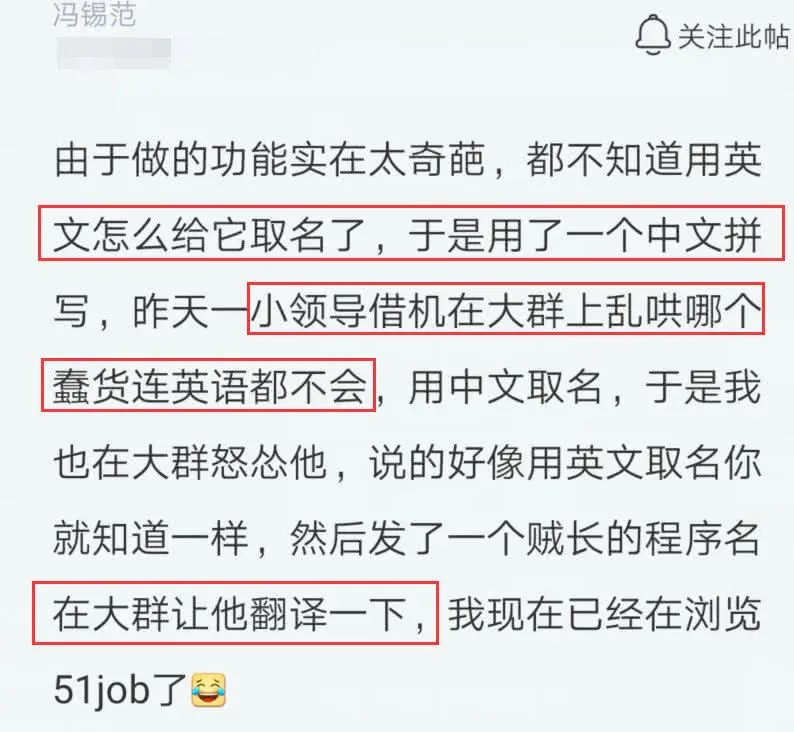 而该程序员并不服气,直接在群里怒怼:你自己翻译试试,然后给领导发来了一串很长的程序名。结果领导也没有翻译出来。而最后的结果是这个员工得罪了领导,只能辞职,现在已经忙着找工作了。